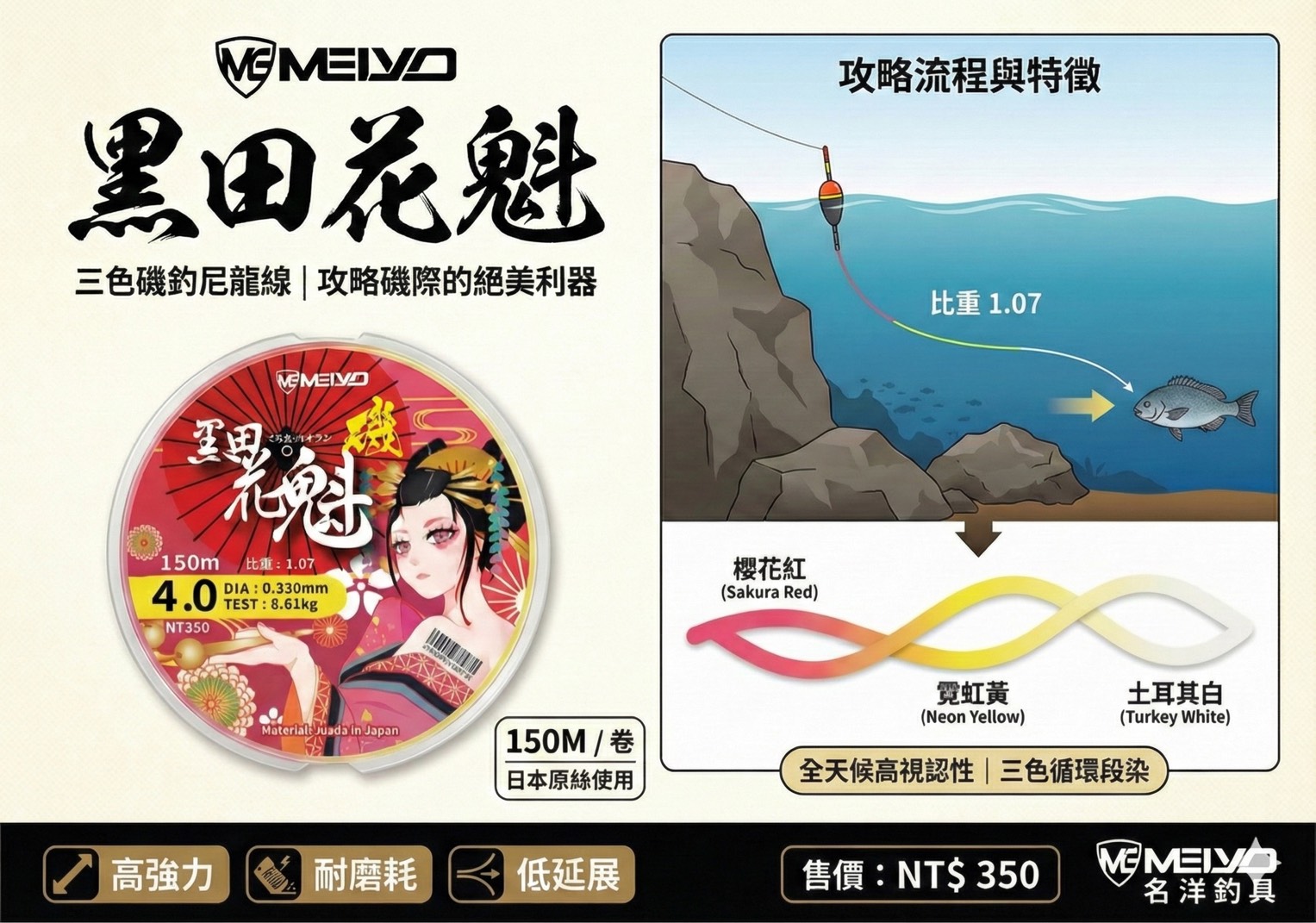MEIYO 黑田 花魁 三色 磯釣尼龍線 150M